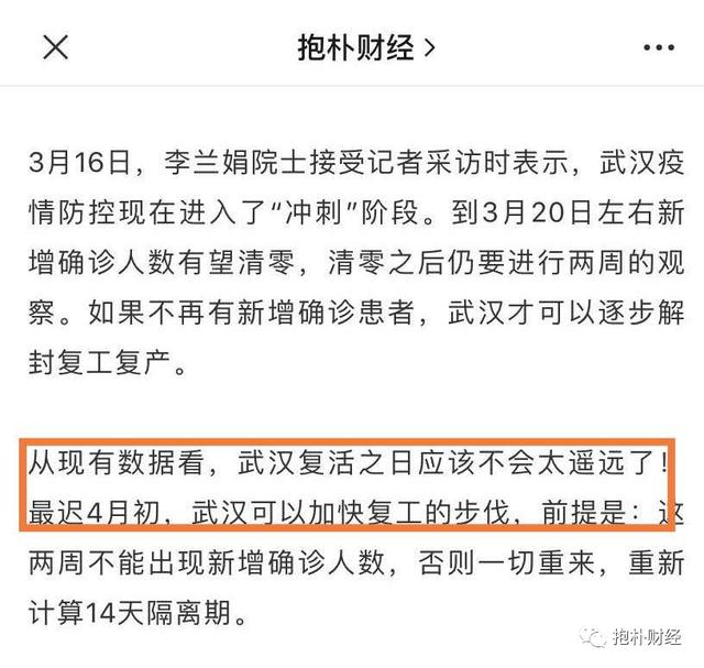 我的三原则是:尽量少出门,出门戴口罩,回来就洗手。好多广州人应该也是这样,这是全体市民的努力。 3月18日,我在抱朴财经发表过一篇文章《休克的武汉经济何时复活?》,当时武汉的几位朋友对武汉“解封”(即武汉人赴外地上班,以及滞留武汉的人离开武汉,企业加速复工)表示悲观,认为到六月份都没有希望,官方当时也未明确表态,我们当时根据信息综合判断,明确写下这样的句子——“从现有数据看,武汉复活之日应该不会太遥远了!最迟4月初,武汉可以加快复工的步伐……”