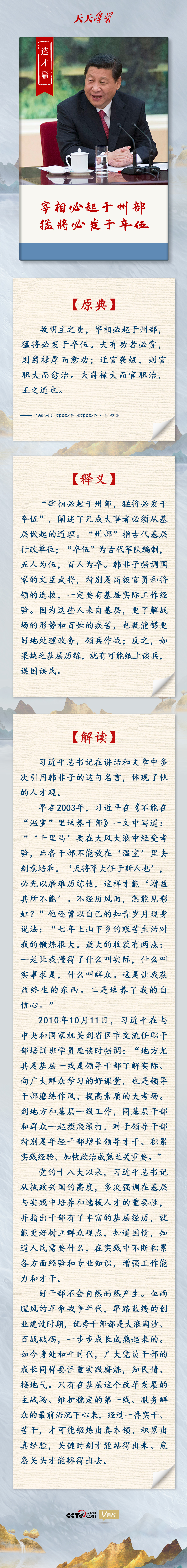 编者按:中央人才工作会议9月27日至28日在北京召开,习近平总书记出席会议并发表重要讲话。党的十八大以来,总书记站在党和国家事业发展全局的战略高度,对我国人才事业发展作出一系列重要指示。在讲话和文章中,他大量引用有关中国古代人才思想的典故,就如何选才、敬才、求才、育才、用才等话题,提出了一系列新思想、新观点、新论断、新要求,为新时代做好人才工作提供了根本遵循和行动指南。《天天学习》带您一起学习回顾。