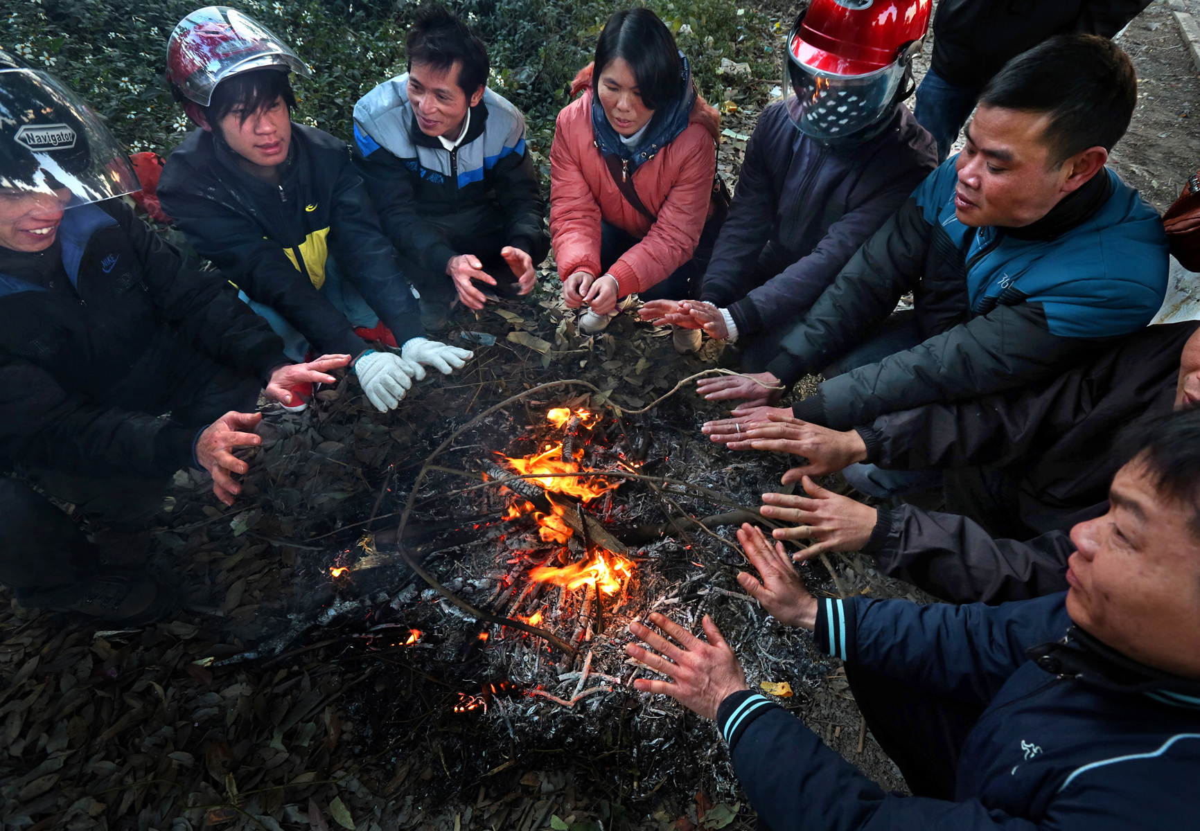 2010年,途经封开的一个路边服务点,“摩托大军”在烤火取暖。通讯员 朱健兴 摄