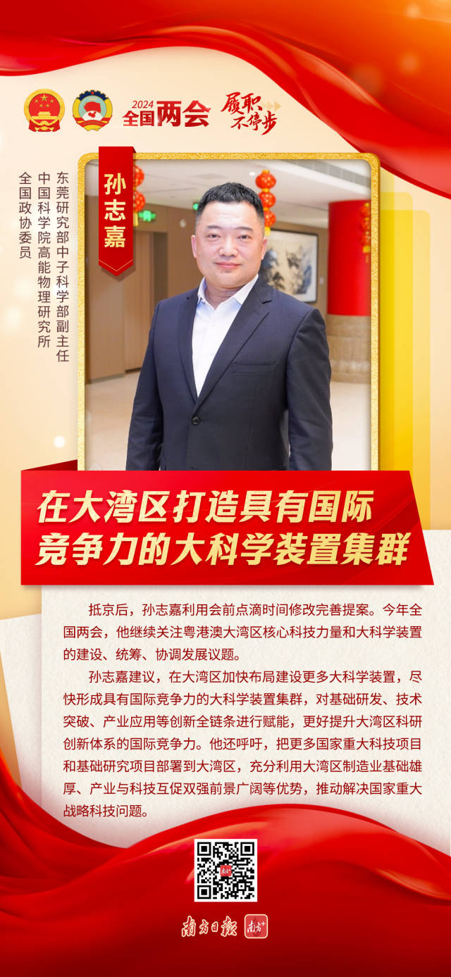 “新质生产力是一个大命题,把这个命题分解下来,很重要的一部分是发展好基础研究。建设有国际竞争力的大科学装置集群至关重要。”孙志嘉表示,今年全国两会,他将继续关注粤港澳大湾区核心科技力量和大科学装置的建设、统筹、协调发展议题。