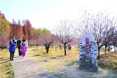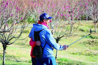 桃花岛景区内粉红色的桃花竞相绽放,市民游客们漫步花海中,感受沁人心脾的花香,不时拍照留念享受新春的欢乐。据了解,桃花花期是1月中旬至2月底,春节假期是最佳赏花期。