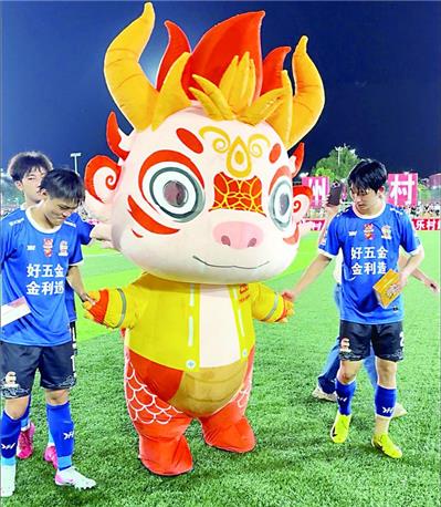 金利镇吉祥物“智慧金龙”到村超赛场为金利队加油。记者 李志斌 摄