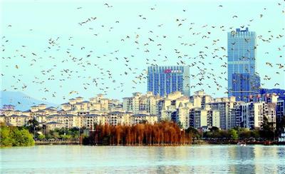 每当夜幕降临,位于城中央的美丽星湖便迎来“万羽投林”的神奇时刻:无数鸟儿从四面八方飞来,或盘旋、或俯冲,争相扑进湖中岛屿的丛林里。万鸟归巢、城湖一体,成就了多彩星湖的别致风景线。