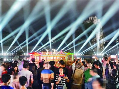 同样展现古韵与新潮交融的,还有“璀璨星湖”光影秀。随着音乐响起,一道道光束划破夜空,东门广场附近的星湖水域瞬间流光溢彩。光影交织间,一艘游船缓缓驶过,波光粼粼,与身后的皎杯石构成立体景观,生动诠释了“夜赏星湖·灯读广府”的独特韵味。“光影秀与秀丽山水相互映衬,十分梦幻。”本地市民陈小姐赞叹道。