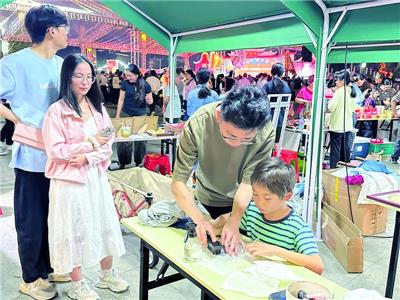 庙会上,倪少宜、李宝庆等非遗代表性传承人来到现场,面对面与游客交流,讲述非遗传承背后的故事。集市还设置非遗互动体验区,现场教学传拓技艺、四会绳编、活字印刷、古法南药制香等传统技艺,吸引不少亲子家庭踊跃参与。